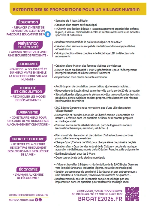 À travers ce programme, nous assumons une ambition forte : développer à Bègles un maillage Humain exemplaire, protecteur et innovant, capable de concilier justice sociale, exigence écologique, qualité de vie et sécurité renforcée pour toutes et tous.